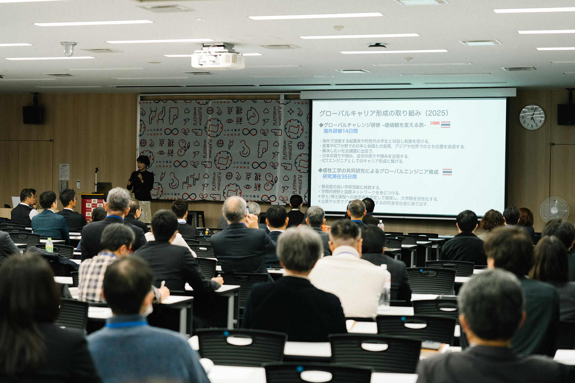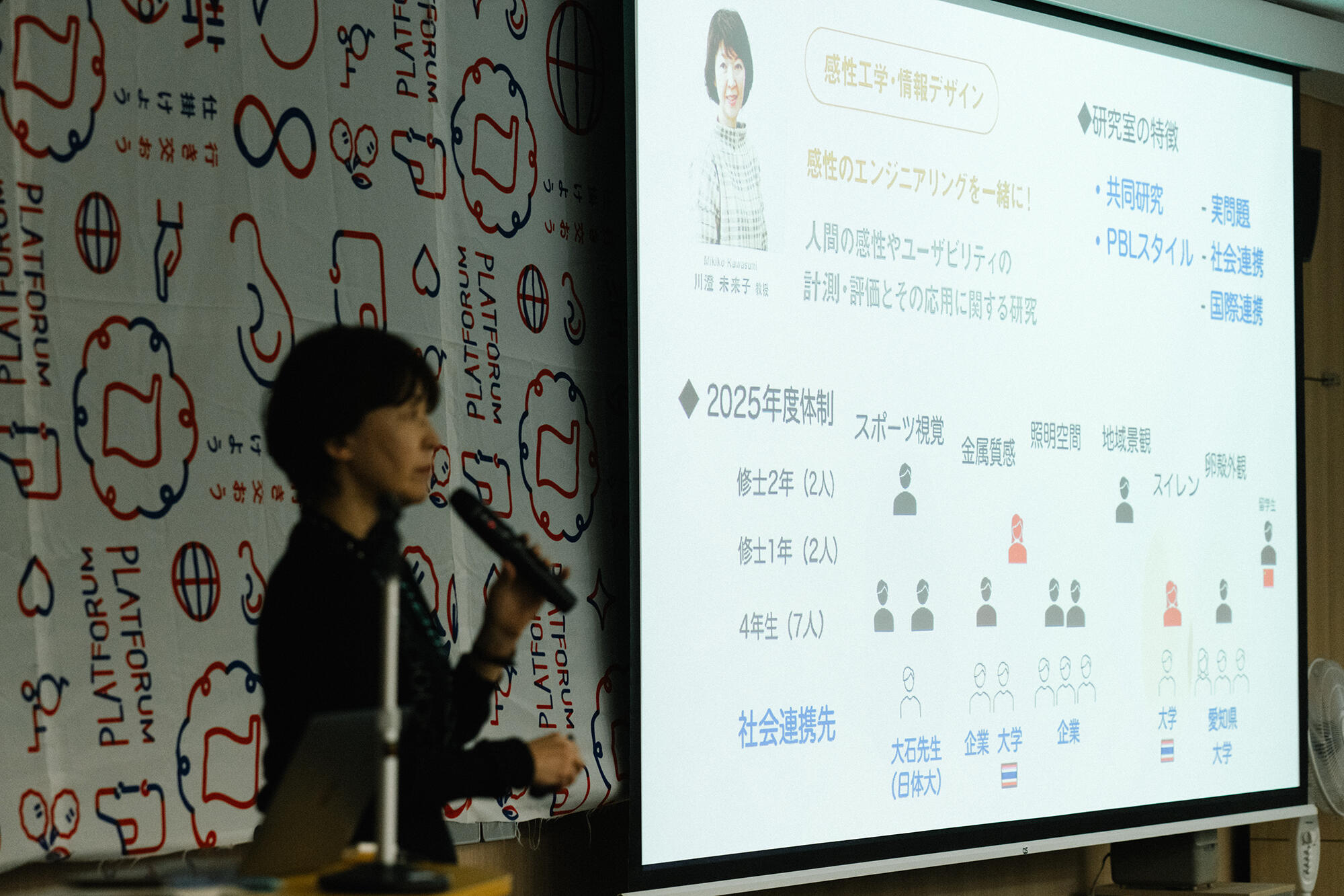 2人目の事例発表は、本学情報工学部の川澄未来子教授です。川澄教授は人間の感性をものづくりに活かす感性工学を専門としています。研究室の特徴としては、企業や自治体との共同研究が多いこと、PBLを実践していること、多くの実問題を扱い、社会連携や国際連携にも積極的なことなどを挙げていただきました。2025年度は院生4人、学部生7名体制で、工業製品から農作物まで、それぞれ企業や自治体、海外の大学などの連携先と組み、学生がチームで重なりながら取り組んでいます。